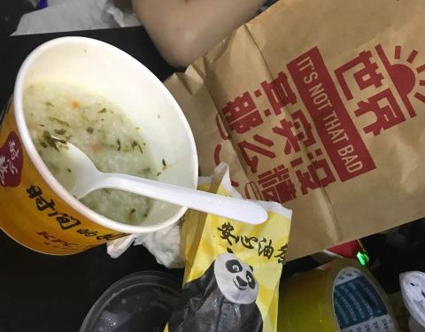 早餐一如即往的选择雪菜鸡肉粥配油条,别的不敢说,肯德基的早餐确实不错,特别是粥,熬的不错