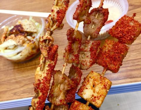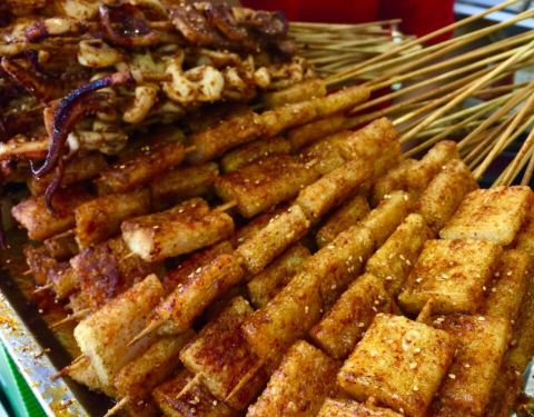 座无虚席的小吃店,各种各样的炸串鲜香诱人