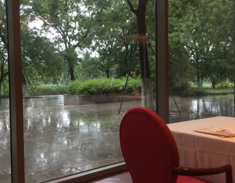突如其来一阵铺天盖地的暴雨,直打得天地混沌化为一色虚无,雷电交加直接打断了酒店内五谷餐厅的供电,好吧,既然下雨天如此盛情留客,不想勉为其难,就去中餐厅一探吧。 颐丰阁的风格非富贵逼人的那种,整幅落地玻璃窗,直接将室外绿植的生机盎然映入眼前。在此用餐,环境还是颇为雅致的,虽近饭点,客人并不算多,有五六桌客人吧。 服务生绝对是训练有素,态度相当彬彬有礼,绝不会热情到让人难受的那种,感觉很有眼力劲儿,邻桌客人是一位上了年纪的女演员,只闻服务生客气的推荐菜肴,并且结账时,主动问询菜色是否满意,还很周到的寒暄,请这位客人有空再度光临。不好意思,实在是本人耳力非凡,没有故意去偷听之嫌。 好吧,言归正传,说说菜肴的水准吧。 这家店如果光光说菜品,可以给五分好评!无论是河虾的鲜美超弹的口感,六月黄的色香味俱全,烧味拼盘中的叉烧简直就是食神大赛中获奖的那份,黯然销魂的口感,秒杀绝大多数的粤菜餐厅。 鲜肉月饼最讲究的就是酥皮和馅料的搭配,实话实说,大师傅高超的手艺,再次证明了自己的实力非凡,下次能不能做得再大一点点啊,太好吃了,咬开一口就没有了,未免有点意犹未尽!奥灶面的面对了,顺滑细腻,汤头有待进一步提高,我试过南园宾馆旁的老字号店铺的味道,就决出了那一分的优势。 如果想要挑挑瑕疵的话,不得不感慨一下,这家餐厅的贵,随意一道荤菜价,都是两百元以上,素菜也是一百多,买单还要加上15[%]的税金➕6[%]的服务费,度假酒店一般给住店客人总有些优惠,仿佛昆山费尔蒙酒店这点做得比较小气。