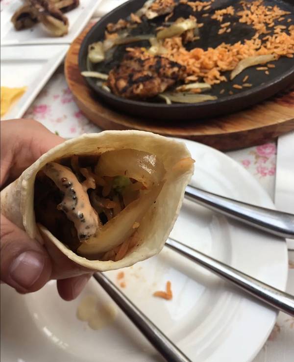 【鸡肉法式哒】里面有鸡肉 洋葱 炒饭 配合着薄饼卷着吃 再抹上沙拉酱和牛油果酱 别有一番味道 有点像老北京鸡肉卷[害羞]