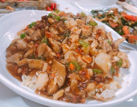 炒圣子,椒盐鲜鱿,姜葱炒蟹,带子炒西兰花,海鲜炒饭 驰名烧鹅真心出色,肥美多肉,同埋嗰酸梅汁非常好味
