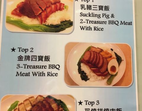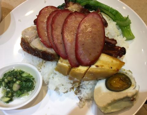 从中环半山手扶梯一路下来,在域多利皇后街的出口,看见斜对面有一家龙记饭店。店面虽不大,但是有一种花团锦簇的感觉,蛮地道的中国风。点了他们家最受欢迎的金牌四宝饭。所谓的四宝就是油鸡、叉烧、红肠、还有...
