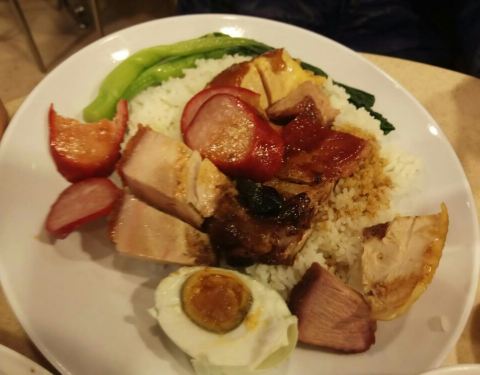 从中环半山手扶梯一路下来,在域多利皇后街的出口,看见斜对面有一家龙记饭店。店面虽不大,但是有一种花团锦簇的感觉,蛮地道的中国风。点了他们家最受欢迎的金牌四宝饭。所谓的四宝就是油鸡、叉烧、红肠、还有半颗咸鸭蛋。份量对于女生来讲真的是太多了,不过好在它有配蔬菜,虽然只有少少的两根,但还是比很多的港式茶餐厅要好多了