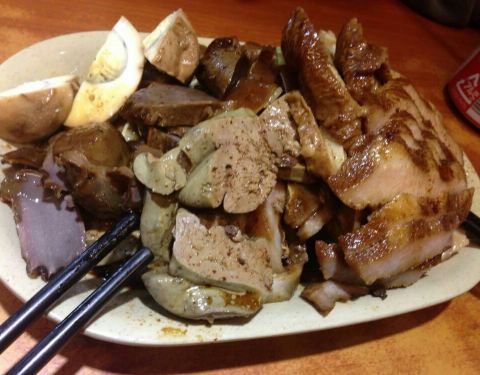大家千万别去了,就是一个黑店,专黑大陆人的店,我刚刚从他家出来,老板见我们是大陆来的,推荐说来个拼盘,多尝几样,先说是298元,后来我们说不要米饭和汤,他又说198元,还说加100元,我给你们切点鹅,我们说吃不了那么多,先不要鹅了,老板和老板娘很不高兴,结果他没有现切,从案子下面拿出一盘现成的,下图第一张就是,我们一看鸡蛋(15元3个,肯定不够数),豆腐(豆腐15元三块也不够),肾有几片(20一个),几块大肠(大肠15一条),几片猪耳朵(15元一块),几片猪颈肉(108元一斤),还有几小片肝,大家一看就知道被坑了多少钱,下面第二张图是本地人买的鹅和鹅肝,一大盒120元,对比就是这么强烈