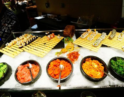 三文鱼应有尽有,反正空了就会填上,不说质量有多好吧,至少和一般自助餐差不多; 海南鸡超好吃的,忍不住多次了几块,海鲜泡菜饼也是一吃再吃,炖奶也不错,。。