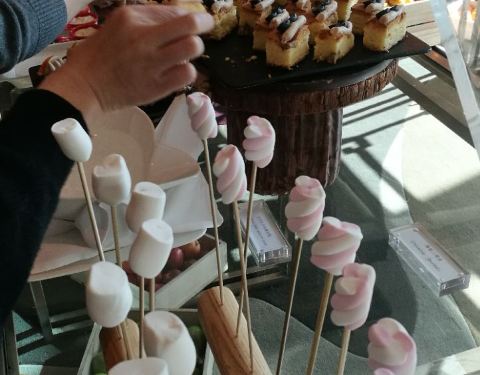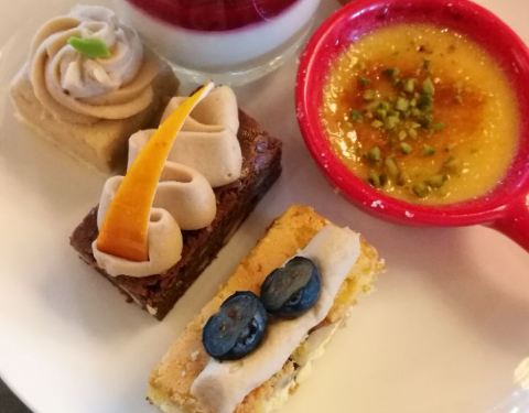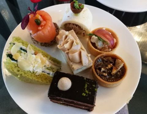 之前有看到过关于坚果系列下午茶的推文,就约了闺蜜一起去吃。大堂环境挺一般的,桌子也非常小,4个人盘子一放就放不下其他东西了,茶壶只能放旁边小茶几。品种比我想象得少多了,我把每种甜点和咸点都尝了一遍,都在图里了,除此以外还有水果,冰淇淋和巧克力喷泉没拍。不过虽然品种不多,味道到是都蛮好吃的。特别偏爱咸点里的金枪鱼卷和三文鱼卷,甜品基本上都比较类似,有一款小小的正方形慕斯和杯子装的树莓慕斯也很好吃~主要是性价比很高,当然我只吃了一轮,感觉有点浪费了。。。