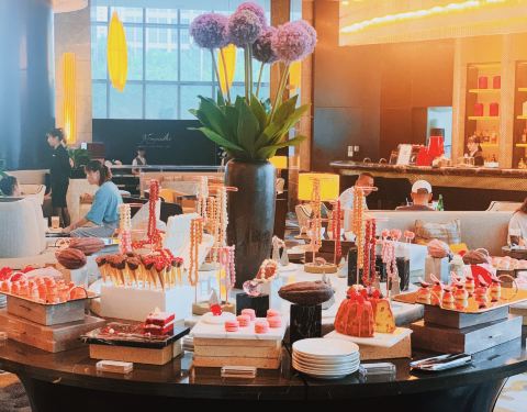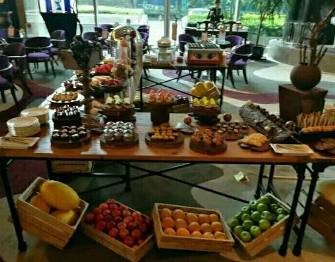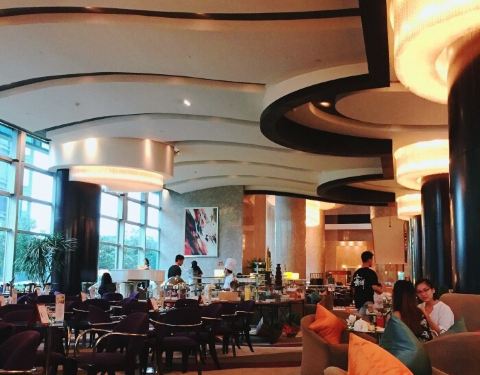 环境很好的酒店,大堂音乐很清新,坐的位置暗雅系的,很喜欢,午茶喝的就是环境;午餐品种不算太多但做的比较精致,还是偏爱甜点大于咸点,蛋糕,抹茶蛋糕,花茶奶冻还不错,冰激凌口味一般不是特别好的,曲奇很好吃,甜的抹茶,咸酥的海苔都不错比较有水准的;蟹肉面包这种面包卷用的真蟹但是很腥;还有比较有意思的巧克力喷泉和自己搭配的松饼;水果也比较新鲜摆盘也ok;美中不足的是茶饮咖啡不续杯,伯爵茶,香草茶,茉莉绿茶,黑茶这种一壶的可以续杯,茶不是特别热;服务比较好,一直有人收桌子倒茶;建议加强饮料咸点