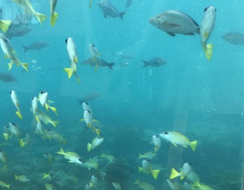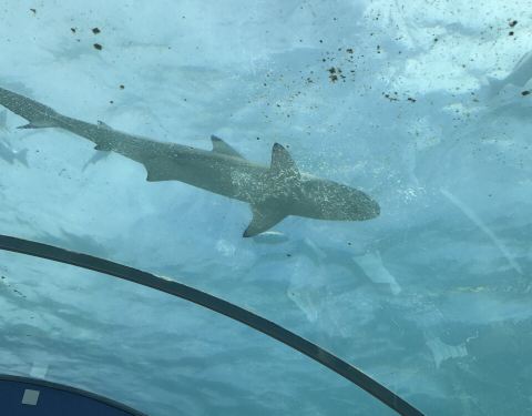 - 中午去吃lunch,海底反光,全程带着墨镜和帽子吃的,特别晒,看着小在玻璃外游来游去,也颇为一番滋味