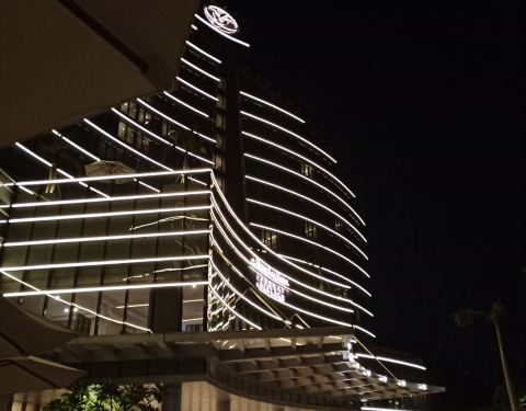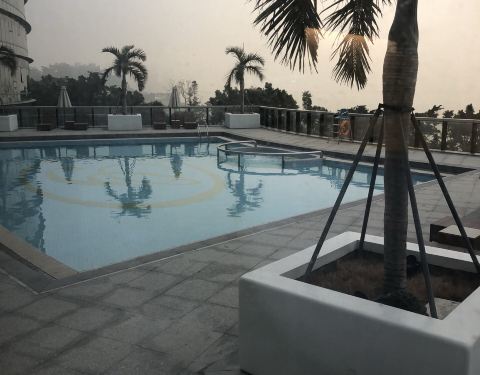 普普通通的一个酒店,不像五星级,没有拍照片的冲动,陈设比较旧,只有卫生间洗手台可能是新装修的,其他都比较老,马桶是电动冲水的,不是太好用,但是好歹有,正面窗户面向大海,就是不能打开,比较憋的慌,24小时送餐,这一点还不错,不过贵的很,一碗白粥28左右的样子,服务员说得过去,到基本都是冰块脸,机械的办理各种手续,问到生日当天入住有什么待遇,达到免费升一个楼层,汗!早餐99一位,普普通通,总体感觉好像浪费了这么好的一个位置