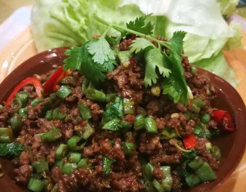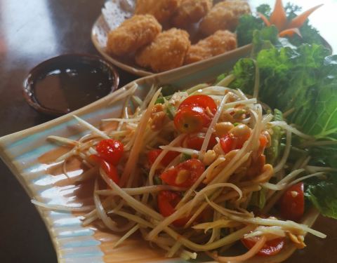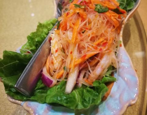 味道正宗,青木瓜色拉(包球生菜吃),炸虾饼,冬阴功汤味道浓郁,强烈推荐,开在酒店里面,所以加收15[%]服务费,但是服务一般般。