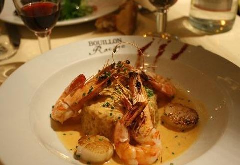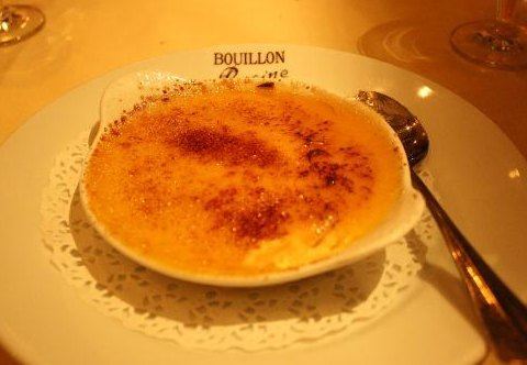 Bouillon是1860年开始兴盛的巴黎工人食堂,供应平价且份量大的热食餐点给蓝领阶级,现在已经转为华丽、平价、传统料理的餐厅了。 来到Bouillon,你会有搭乘时光机回到法国美好时代的错觉。 以平价的传统家常菜。在菜单内,经典的法式前菜如鸭肝、蜗牛、美乃滋水煮蛋。主菜油封鸭腿、勃根地的红酒炖牛肉、法式蜗牛等等。常见的乳酪种类,甜点如巧克力慕斯、焦糖烤布雷…等等,都可以找到。 整个餐厅内可以说蛮吵杂的,不论是顾客的说话声、酒杯声、服务生发出来的盘子的声响…等等,但这种活络的气氛也是bouillon的特色。