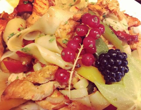 Grillezett rozé kacsamell forró narancsmártással, rizzsel és burgonyafánkkal