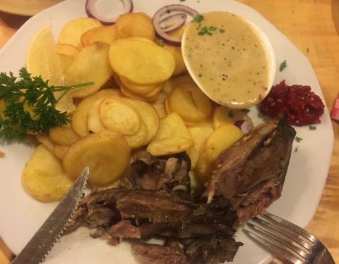 好实惠的价格,第一天晚上去吃竟然没有位置了。只能预约了第二天中午去吃的,鹅肝,牛排,牛肉炖土豆,牛肉牛肉面疙瘩都非常好吃。前餐的土豆泥鹅肝配也非常不错。由于看不懂当地文字,朋友直接给服务员看了点评...好实惠的价格,第一天晚上去吃竟然没有位置了。只能预约了第二天中午去吃的,鹅肝,牛排,牛肉炖土豆,牛肉牛肉面疙瘩都非常好吃。前餐的土豆泥鹅肝配也非常不错。由于看不懂当地文字,朋友直接给服务员看了点评的图片,直接上菜。图中所有菜式+2杯啤酒+2瓶当地气泡水。4人总共话费总共70欧,还没吃完,打包回家了。