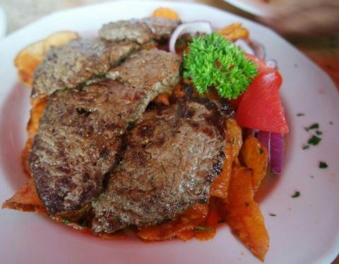看到室外很多人吃饭很红火于是就在这点餐。这的小辣椒做的不错。几乎每桌都有。羊肉配土豆还没有吃过。只知道家里经常用牛肉炖土头。所以也来一份。有一份牛肉汤。最后来了个蔬菜盘。吃起来味道不错。服务也跟得...看到室外很多人吃饭很红火于是就在这点餐。这的小辣椒做的不错。几乎每桌都有。羊肉配土豆还没有吃过。只知道家里经常用牛肉炖土头。所以也来一份。有一份牛肉汤。最后来了个蔬菜盘。吃起来味道不错。服务也跟得上。啤酒和辣椒一起。真受不了。所以中途去了厕所。室内装修的有特色啊风格类似国内郑记全牛肉的风格。有芦苇草。