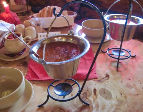 - ...由吊鍋盛上桌來的,分量非常大,還配著新鮮切片麵包,紅辣椒很辣,鵝肝醬口感不錯,整體上還是挺滿意