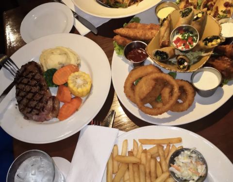 一直以来都非常的喜欢吃汉堡,在旅游的过程中看到了这家主营美式菜的店便决定进去吃个饭休息一下。环境优雅大气,非常的安静,除了吃饭的大厅还有包厢,餐厅的服务员态度特别的好,很热情有礼貌。很喜欢他们家的小吃拼盘,里面有洋葱圈、鸡翅、土豆卷、蛋挞等东西,还准备了生菜,如果吃了腻的话吃一点生菜很快就能解腻,我觉着他们家的一大特色就是给了四种口味用来蘸的酱,不用纠结选哪一种,每样都可以尝试,很细心。推荐他们家的汉堡哦,汉堡的面包和在外面吃的不一样,是那种软中又很实在的,里面有很大的一块乳酪和牛肉,牛肉烤的很嫩,番茄酱汁特别的多,很香。