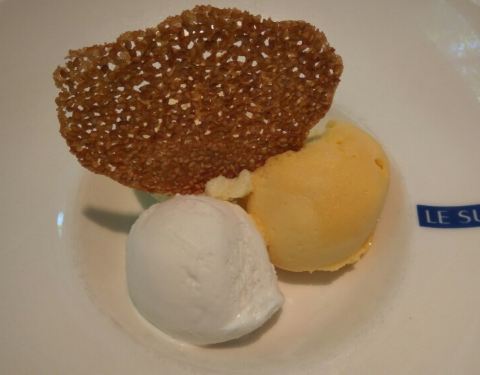 米其林三星厨师的小店之一啊。 餐前面包有两种法棍与传统面包,实在太好吃毫无槽点; 当日推荐的两个主食里的配菜更喜欢有南瓜的,只是因为不吃鸭肉只能点了海鲈鱼。大块海鲈鱼番茄味烩蔬菜彩椒茄子等,无论色彩还是味道都奔放中有节制。比河鲈鱼稍微好一点但是依旧平常的肉质可以达到这样的效果已经属于超长常发挥啦。 甜品是蛋白柠檬派配树莓酱。对于这款法式经典甜品,不喜欢酸味的我定下的起码标准就是一定够酸否则一切免谈。云朵般的蛋白造型不怎么夺人眼球,软硬程度配合极酸的柠檬芯刚刚好。常见的都是黄油塔底,而他们家是焦香四溢的巧克力塔底挺有特色的。