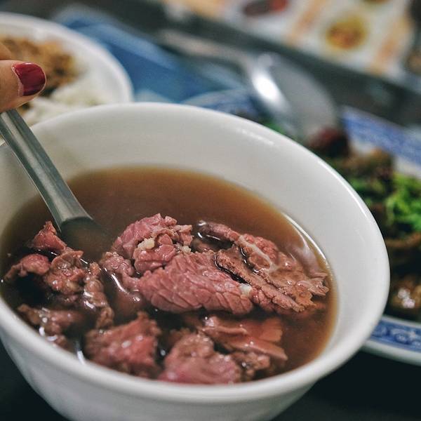 摇着冰沙过来排队,已经下午一点钟,两点就要停止营业了,也算赶上个尾巴,店里每天会限量供应特色牛肉汤,有兴趣的小伙伴要赶早来哦。 营业时间为:17:00-次日14:00,注意,每周一中午两点休息至周二下午5点开始营业。大概一刻钟就排到我们,两人位还是比较好等的。 文章牛肉汤不愧是早市午市包括夜宵都在做,餐点种类很多,除了有牛肉汤、饭面,冷盘与热炒也一样不少。点的比较简单,招牌牛肉汤和麻辣牛杂,同样可以选择附赠白饭或肉燥饭一碗。这家有牛肉燥饭哦。 汤头浓郁,但又没有很重的中药味,喝起来有点甘甜。即使小碗的牛肉汤店家给的量也很足,可以看到牛肉鲜嫩呈粉红色,沾着酱料吃上一口,非常美味,唇齿留香。 毕竟连吃两家牛肉汤,难免心里做个比较。 汤头味道不尽相同,各有特色,但个人更偏爱文章牛肉汤,虽然赶了个午饭的的晚场,可能肉质不是最新的,但是鲜嫩程度已经让人惊艳,即便没有吃到更传奇的六千牛肉汤,我已经很知足了。麻辣牛杂口味偏甜,还是牛肉片的味道更优。就是在这里吃的肉燥饭让我悔恨早晨为什么没有来上一碗。 台南 的卤肉饭水平普遍很高,不必担心会踩雷。