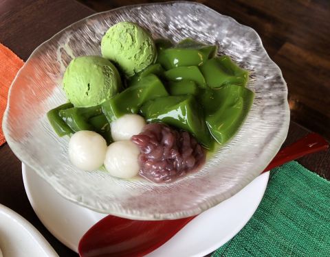 - 茶冻是人气单品,甜品里有白玉丸子、红豆沙、茶冻和茶味冰淇淋球,在柔软的口感里能感受到抹茶的微苦回甘
