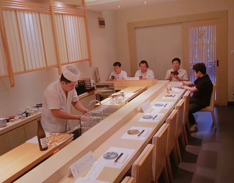 【环境】 一直以来餐饮业的竞争主要集中在味道上,而如今随着时代的发展,光是味道已经不足以吸引食客了,还要有创意。“鮨莲”是一间清新雅静日式料理餐店,注重味沉、触觉、视觉、嗅觉以及器皿和用餐环境的搭配的意境,配合简约而优雅的装潢,为生活步伐急速的都市人,提供新鲜的食材,精致的食物,一个舒适的好去处。 经常在一些日式餐馆挂着和风的门帘,它家也不例外,还肩负起餐厅的门牌和标记作用。帘子从底部中间到接近顶部的位置被分割成两部分,方便通行,还没走进餐厅就已经感受到了浓浓的和风。 进了餐厅之后,第一眼怕是就要落在桌子上了。日式餐厅里必不可少的是这些餐盘, 精致雅致的图案让人欣赏悦目,食欲倍增。 整个餐厅一眼就能扫视完,12个位置,围着前方的大厨180度圈。实在是简单,但生意好到,我们8点用午餐走人,还有客人冒着台风来品尝。 【服务】 当然无可挑剔的,要说不好就只能怪自己没有预订,中间的位置没有坐到,不过旁边也有好处,聊天很方便。 【食物】 前菜:六道当季酒肴珍味小菜(从前至后,从左至右:南蛮白身鱼、酒煮海螺、色拉、海鲜纳豆、鸭胸脯肉、萤火鱿鱼),散发着夏天的气息,摆盘精致,夺人眼球,细品慢嚼,味蕾一下子就打开了。 吸物:海鲜汤,用食材本身的清新鲜美作引子,煮出的汤清澈且自然,一口喝完,暖身,爽。 刺身:有牡丹虾、金枪鱼、扇贝、寒狮鱼、鲷鱼等高品质新鲜食材,用木块夹起食物放入口中,立马入口即化的词语跳出脑海,深深体会有这样的食物,不是夸张形容的。一直以来去吃日料,我是不点金枪鱼的,之前吃的都感觉口感不好,但这次品尝它家的金枪鱼后,改变了我对金枪鱼的看法,柔滑细腻,甘甜清新,不用沾芥末就能入口。 烤物:由于自然烤黑墨鱼肠,不放任何调料,保证了其食物原味,鲜嫩多汁,肠皮香脆带点墨鱼肠本身的海洋盐味,超级稀饭。 煮物:黄油煎鲍鱼,肉肥细腻带醇厚的黄油味,文武火交替熬制成,一定要趁热吃,才能品出大厨的用心之作。 寿司:7款指定寿司, 款款经典,一吃忘不了,有蓝鳍金枪鱼寿司、手工青花鱼寿司、和牛寿司、马粪海胆寿司等,品寿司旁边要放姜片,有杀菌消毒、清除口气之功效,每吃完一种寿司后吃一些姜片就可以品尝到下一碟寿司的原汁原味和尝到鱼生的甘甜与新鲜了。吃寿司的顺序,就在于味蕾的刺激进阶,徐徐上升,才能享受到多种美味。 小丼,三文鱼籽饭,也是很养眼的一款食物。 味增汤:牡丹虾头与昆布熬制的,本人不是很喜欢喝味增汤的那股