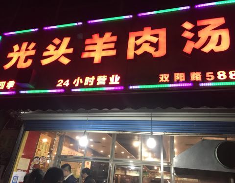 光头羊肉汤店在上海的东北角,杨浦区双阳路上,是一家二十四小时营业的店。店里经常座无虚席致要等位,喜欢吃它家的汤,料足味浓,饿得时候加份拌面。
