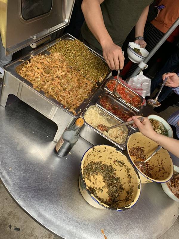 排队点单,然后拿粉,总的也就几分钟,阿姨们烧粉真的超级快啊;再自己加料,找位子坐下,桌上有醋、辣椒等作料可以自行调料。