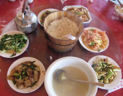 在丽江前往虎跳峡的214国道上,此处已很靠近桥头镇,对面就是虎跳峡口了,在这里看玉龙雪山景致非常漂亮。餐厅前不着村后不着店,有个小停车场,一看就知道是做自驾生意,以及旅游团队会停靠。卫生环境还可以,我们吃的是团餐,很简单。他家还真的是自己养的猪,感觉口味也确实不错。