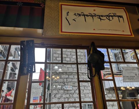 因行程调整原因,头一次能在拉萨逗留一整天,打卡了几处网红店。其中就有这家在八廓街附近的藏餐厅。 八廓街附近的路不是很好找,有几家店都在八廓街延伸出去的胡同里,好在现在手机功能发达了许多,用APP地图的徒步导航功能就能给指过去。 餐厅的装饰是非常典型的藏式风格,店里燃着酥油灯,满满的香气。 看了网上推荐尝试了他家的安多牦牛盖饼,确实很好吃,牦牛肉也很嫩。其他菜也不错,不是很浓重的藏餐口味的做法,比较适合各地来的游客来品尝。还有酥油茶也很棒,很香。