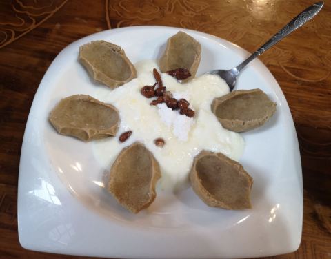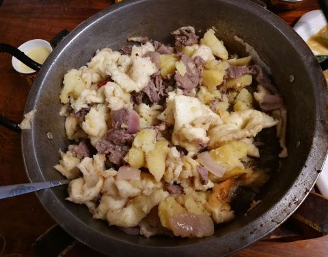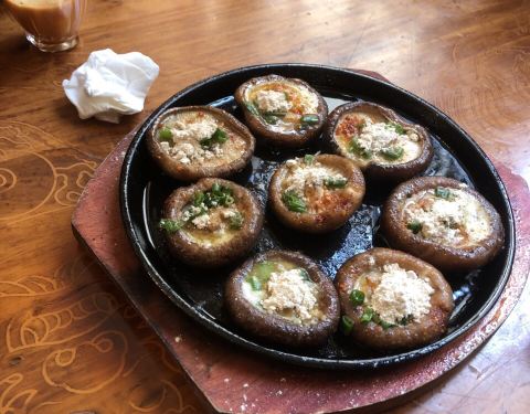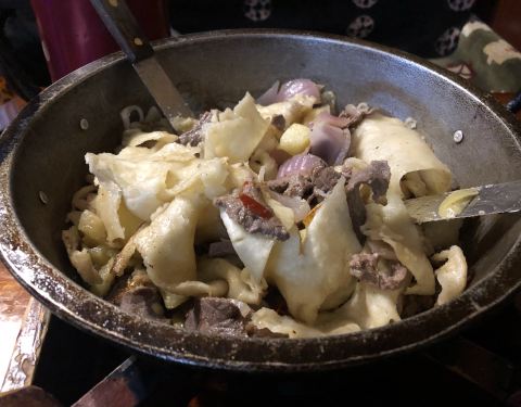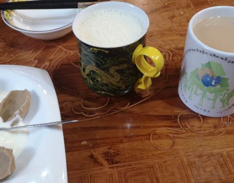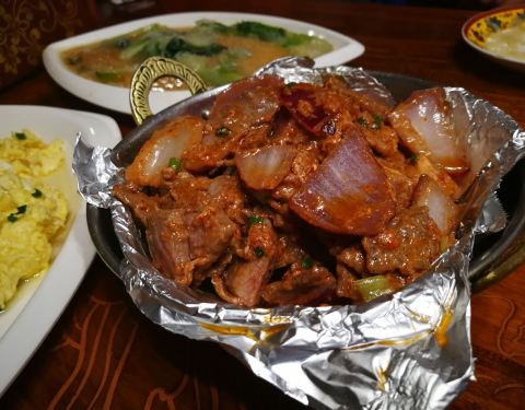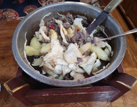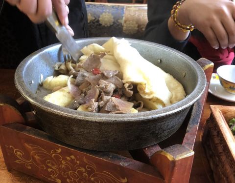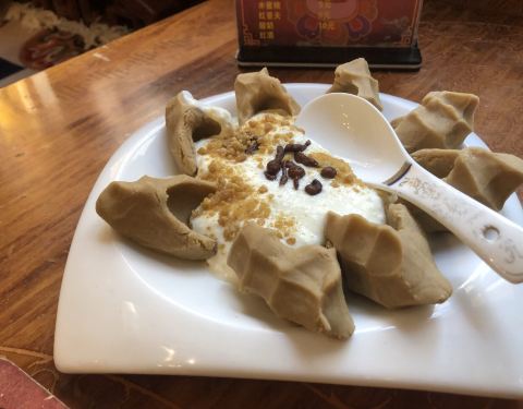 从网上找到的这家藏餐店,门脸不大,差点走过。里面是藏式装饰。我们没吃过藏餐,不知道能不能适应,点了安多盖饼牦牛肉小锅,上面是一张发面薄饼,下面是土豆、洋葱和牦牛肉等,像我这种不常吃肉的人都觉得好,土豆入味,洋葱香,牦牛肉是瘦肉,有浓郁的黑胡椒味道,非常好吃;点了一个酥油烤香菇,香菇鲜嫩,香滑适口;点了一个青稞窝窝配酸奶,这是看周围好几个人点我们也点的,我们两个人已经吃不了了。酸奶说是他们自己做的,口味比我们平时吃的酸奶酸,我俩加了好几勺白糖吃的,也很好。酥油茶10元一壶,我们转经累了喝正好,一壶都喝了。总之吃得很开心,希望下次再去。