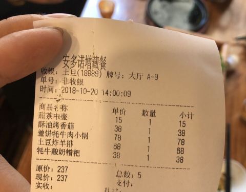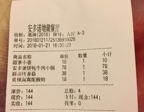 【服务】我先去的总店,结果装修,门口在活泥的居然是美美的老板娘,她放下手里的活,带我穿来穿去,到了分店。 店里的小哥跑前跑后,笑容满面,虽然汉语说快了会听不明白,但是一直乐呵呵地,路过桌旁还会问一声:口味怎么样啊,让人觉得一直在被关注。 【安多盖饼牦牛】我一个人,小哥推荐了这道特色,既有牦牛肉,又有洋葱、土豆,上面青稞粉的盖饼。端上来时,主动帮我拌开。肉多点就好了,热乎的时候很好吃,饼上有了肉的汁水,肉没有风干肉的膻味。 【自酿青稞酒】一壶30,我说能不能卖个小杯我尝尝?小哥听错了,直接送了我一小杯。真的好喝!甜甜的,当饮料,一点也不会醉,没有酒的苦味。