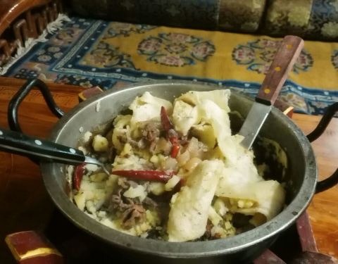 这家店在当地的藏餐里也算是小有名气,有一个总店,还有一个分店。后者好像更大一些,环境也稍好一些。菜品是一样的,特色是安多盖饼牦牛肉,烤的脆的地方尤其好吃。