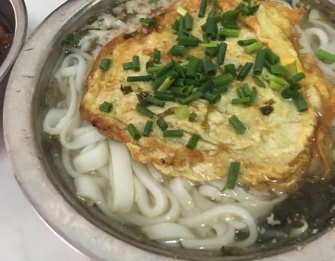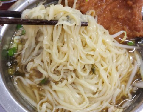 离我去的阿胜猪脏粉很近 在同个街道里 点了份17元的排骨面,选了扁面不要放味精 在已经吃了一碗猪脏粉情况下,米面剩下了,大排吃完了,和上海的大排面不同,温州喜欢加肉糜 这家店生意很好,坐满,老板人也很好,还会关心你东西好不好吃!