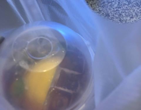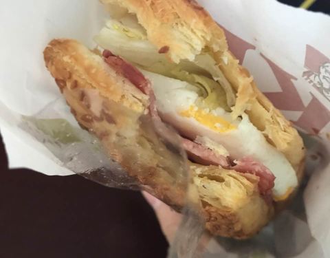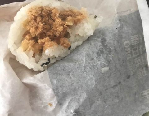 肉松的饭团太咸了,里面油条、肉松、应该还有榨菜之类的,都是有盐的,放一起太咸,米就薄薄的一层,可以米多一些,榨菜少一点综合一下就好了。冰豆浆可以。
