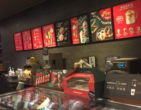 这家星巴克位于万达广场近大门处,去的时候是晚上七点多,客人不是很多。咖啡和糕点跟其他分店一样,不用怎样考虑就点了单。里面的卡座都有电源插座,方便为手机充电。