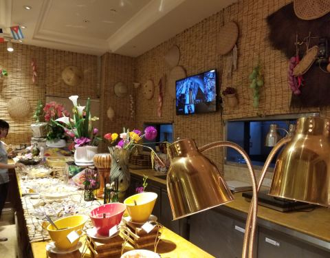 服务好,菜品也行,但座位安排得有点挤,因为度假型酒店,老人小孩子多,拿着食物穿梭,看着会担心