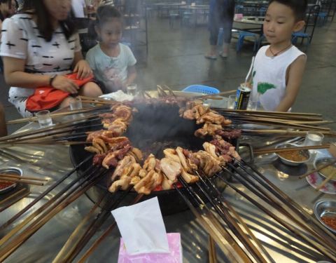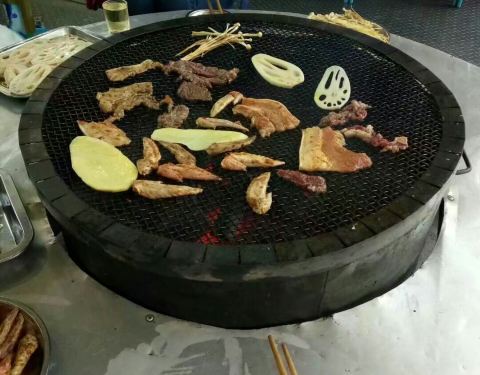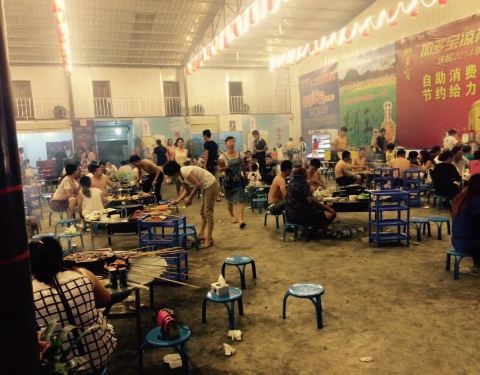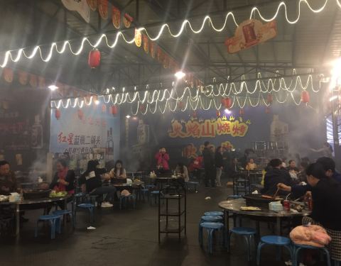 很有氛围哦,味道虽然一般,但是体验很爽。场地很大、人非常多,串肉的竹签子估计有50厘米长,虽然半天肉都烤不烂,但是吃的很有心情啊。都是自己烤的,没有什么调料,就烤熟了沾着辣椒面吃。烤鲫鱼和烤茄子是他们单独烤好端上来的,鲫鱼烤的嫩、也好吃。荤菜都是50或60元一斤,半斤起点,不是按串点的,所以人多好点菜,人少就吃不了几样。