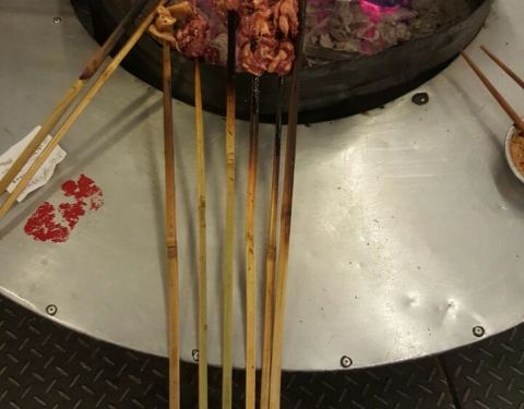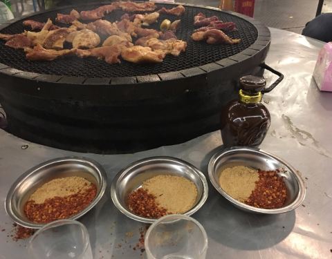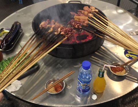 非常传统的本地烧烤,烤小肠和韭菜是绝配