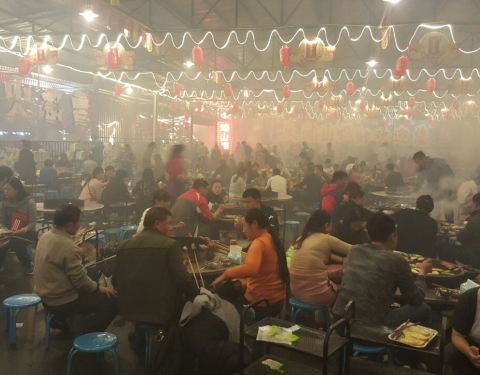 很有氛围哦,味道虽然一般,但是体验很爽。场地很大、人非常多,串肉的竹签子估计有50厘米长,虽然半天肉都烤不烂,但是吃的很有心情啊。都是自己烤的,没有什么调料,就烤熟了沾着辣椒面吃。烤鲫鱼和烤茄子是他...