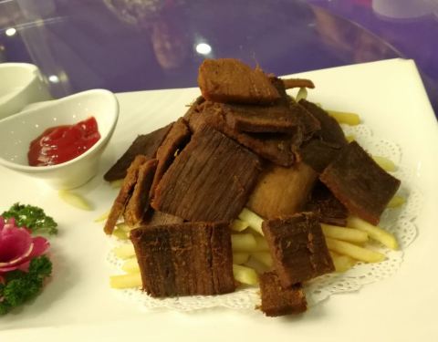 ...,只能在大厅了,环境还是很好的,特意点了两个基尼斯之最,味道不错,特别推荐考羊尾尖肉,特别好吃