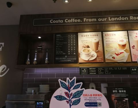 这家“COSTA COFFEE(上海外滩)”咖啡馆位于上海市黄浦区中山东一路387号,就在外滩观景平台下面的临街商铺中,旁边就是外滩观光隧道的入口,靠近北京东路的路口。 这家咖啡馆的面积比较大,双开门的店面,进深也很大。店堂的装修简洁,也不失舒适感,各种类型的餐位都有配置,方便顾客各取所需。