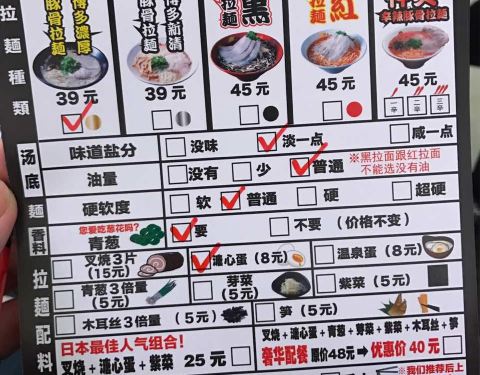 博多一幸舍的拉面馆就是这种调性,很喜欢日式卡座的私密性,对面的座位隔开了,一个人,一张椅子,一双筷子,一张碟,一碗拉面,不愿被打扰的时候,自己来吃碗面也可以很自如。环境宽敞、灯光明亮。 自制中粗面条,口感自选,软硬随你的意愿,点餐的时候勾好。汤底明火熬制,火候更足,香味更浓! 味道的咸淡,加不加葱花、洋葱都有得选,更无论搭什么五花肉、笋干、温泉蛋等配料,应有尽有。 更有日式饺子、猪肉及唐扬炸鸡球等等,非常值得推荐。