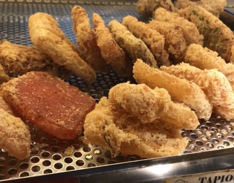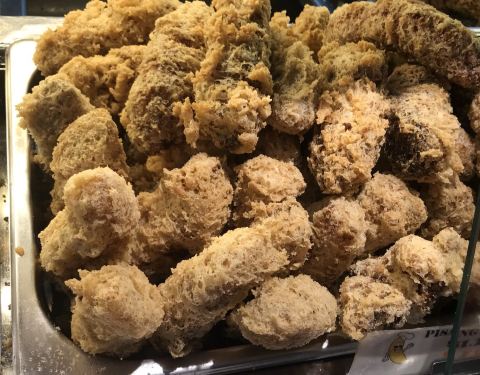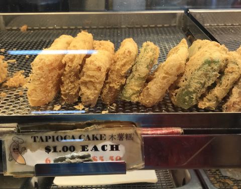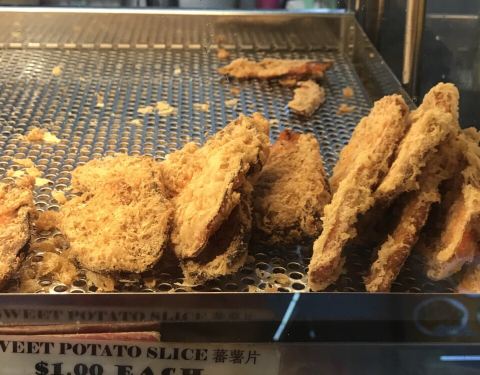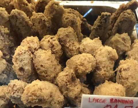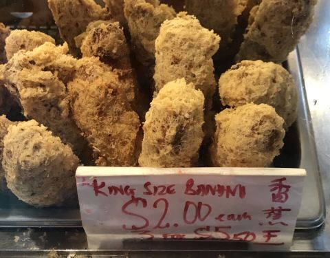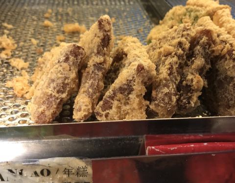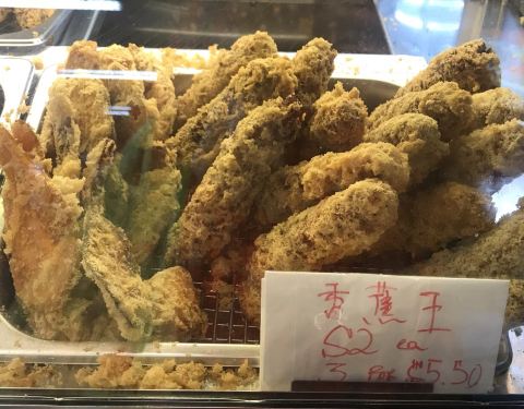 炸香蕉是新加坡非常普遍的小吃之一。把香蕉裹上一层粉浆,放入滚油锅里,炸到酥脆,吃起来口感外酥内软。 这家的炸香蕉因为品种不同,所以分小、中、大和巨大几种Size 用来制作炸香蕉,通常会选择一些淀粉较高,糖分较少的香蕉品种。不过我喜欢糖分较高的香蕉 就选小Size 热油把甜甜的小香蕉炸成泥,好像在吃炸香蕉冰淇淋 除了炸香蕉,还有炸番薯、芋头、绿豆糕、年糕、金针菇、木薯糕等等,都好吃 不过不要吃太多哦,会喉咙痛的