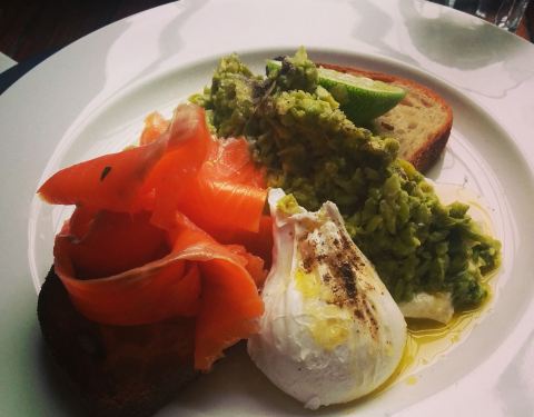 Broadbean and sweet pea mash with fresh ricotta and smoked salmon. Order an extra poached egg for a special treat. One of the best breakfasts in Sydney.
