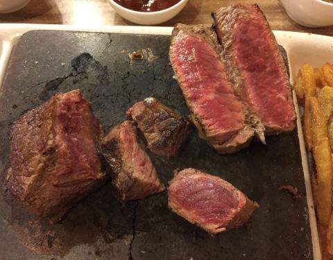 生意很好的一家店,因为主打岩石烧烤所以看着很诱人,牛排有很多部位选择,生的牛肉直接放在岩石上上桌现烤,生熟可以自己掌握,生一点的话肉质更加嫩一点,很好吃,这边套餐包括薯条和沙拉,吃的蛮舒服的,另外还点了烤鹌鹑也蛮不错的。