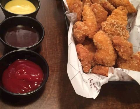 这家店找的好苦~地图有点不对兜兜转转了一圈才找到。两个女生点了一份全鸡炸鸡,蒜香和香辣一样一半,两杯生啤,一份玉米片。大概人民币200多,跟内地比还是小贵呢。