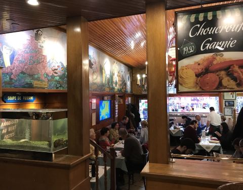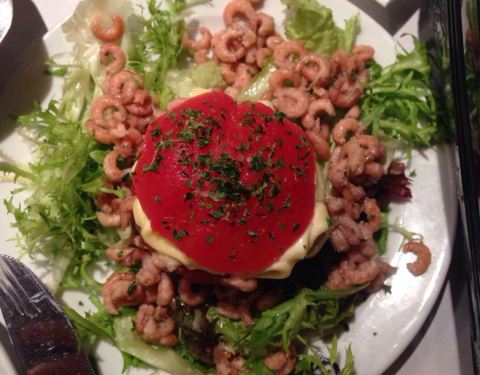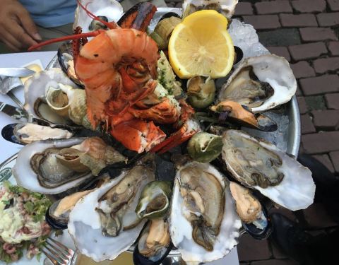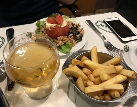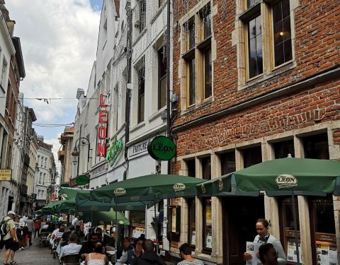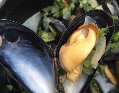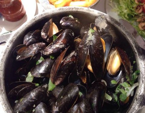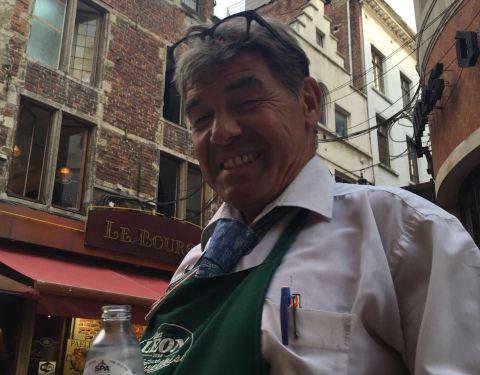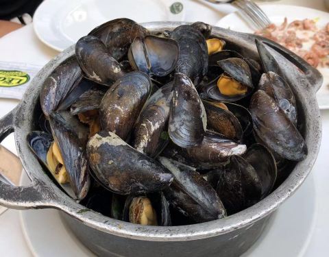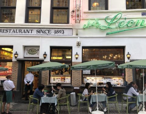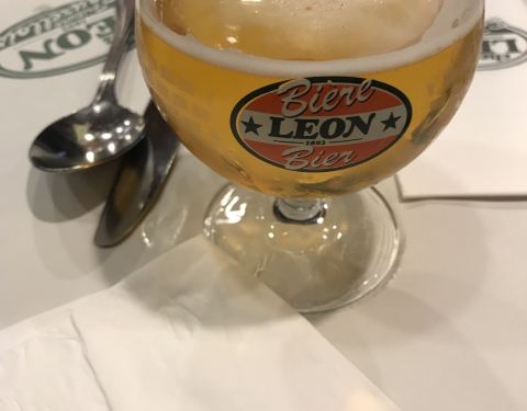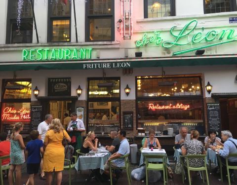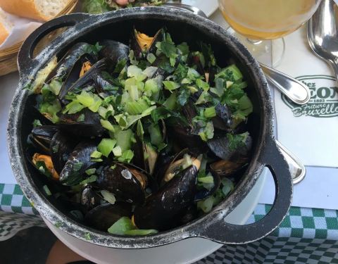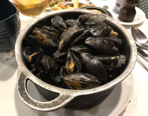 这家店位于布鲁塞尔著名的海鲜街Rue des Bouchers, 附近有多家青口店,但是以这家更为顾客盈门。傍晚7点到店,这天很热,但还是选择了室外街边的座位,每张桌子都很小,也挨的很近,街道不宽,不断有行人走过。走进店内有空调,发现楼上楼下几十桌空位,然而大部分客人选择了室外的座位。点了水煮青口芹菜和一个龙虾生蚝螺贝拼盘,小桌子勉强放得下。为我们服务的是位和蔼的老者,动作麻利,上菜速度挺快。青口用料非常新鲜,非常干净,一大锅没有一个感觉到沙子,煮的火候恰到好处,鲜嫩可口,调料当地产的去皮小虾也味道不错,吃完青口露出锅底奶白色的汤汁,喝过觉得青口的味道已经充分进入汤里。拼盘也非常美味。晚餐结束后竟然出了一身汗。