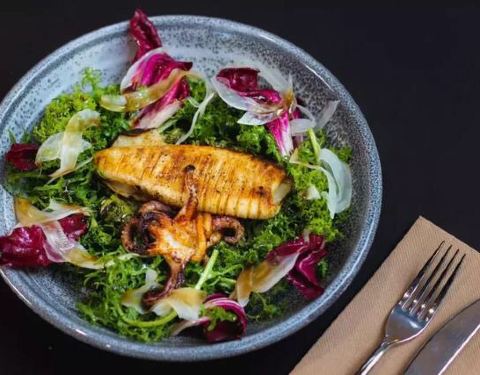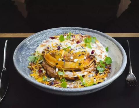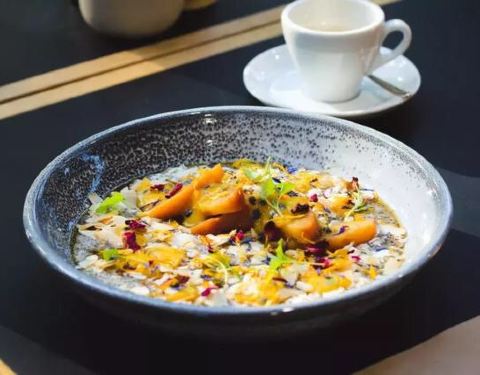 餐厅内戏剧性的落地窗充满了自然光线的广阔空间。适合餐馆的工业建筑,室内有抛光混凝土地板,顶部有裸露的铜管和红色管道。多个咖啡师在房间中央设有一个不锈钢材质的椭圆形酒吧。另一面,叉车正在卸载托盘,这...