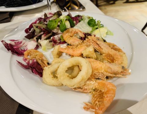 店里环境不错 感觉很优雅 没想到跟团游还能来这样的餐厅用餐!炸海鲜味道很赞 每人一大盘 而且虾和鱿鱼也很新鲜 甜点提拉米苏也是超级棒的 绝对可以代表当地的水准了 好吃不腻!