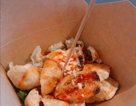 ...放在纸盒子里面,炸豆腐的味道很不错哦,冬阴功做的一般般,感觉是用冬阴功的粉冲出来的汤,味道一般