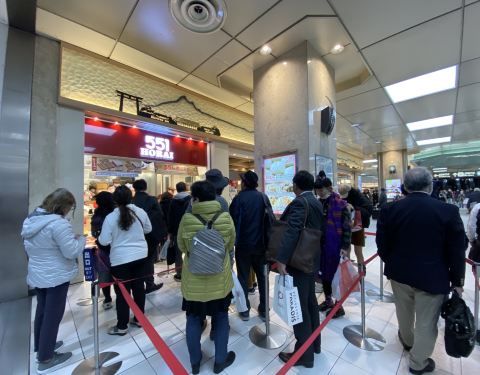 往返伊势丹这边都看见排队等吃的,什么生意这么火?好奇过去瞧瞧,原来是著名的蓬莱551包子!号称一天能狂卖14万个,可堂食也可打包带走。内馅里特别添加了洋葱,因此十分的香甜,面皮也是很Q